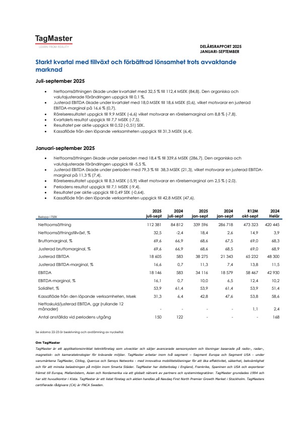 Om vi ser framåt kan jag konstatera att TagMaster är väl positionerat för att bidra till lösningar på några av de stora utmaningar som världens transportsystem står inför såsom trängsel i trafiken i tätbefolkade områden, ökad säkerheten i trafiken samt reducering av utsläppen från trafiken. Det gör att efterfrågan på våra lösningar ökar och vi är fast beslutna att fortsätta stärka TagMasters position trots att osäkerheten kring tullar, geopolitik och regelverk har bidragit till en avvaktande hållning på marknaden.