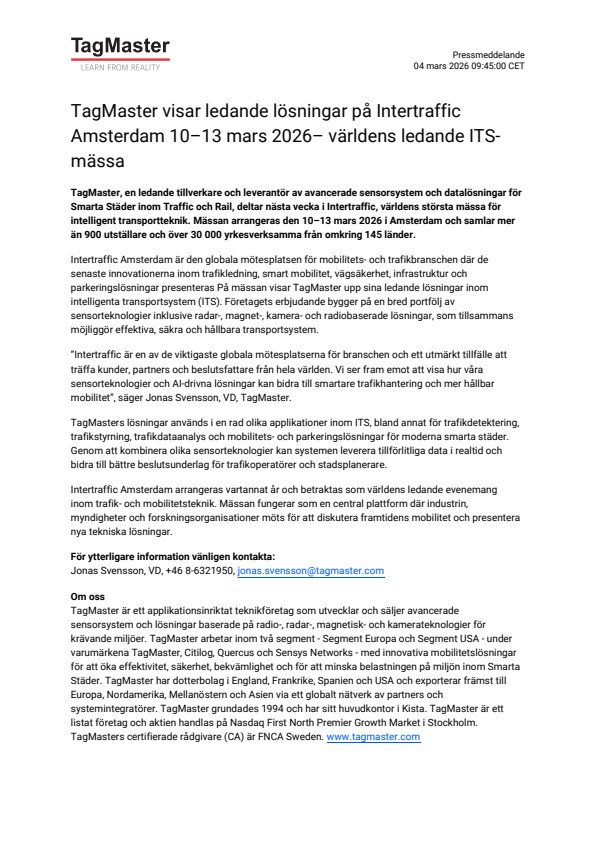 ”Intertraffic är en av de viktigaste globala mötesplatserna för branschen och ett utmärkt tillfälle att träffa kunder, partners och beslutsfattare från hela världen. Vi ser fram emot att visa hur våra sensorteknologier och AI-drivna lösningar kan bidra till smartare trafikhantering och mer hållbar mobilitet”, säger Jonas Svensson, VD, TagMaster.